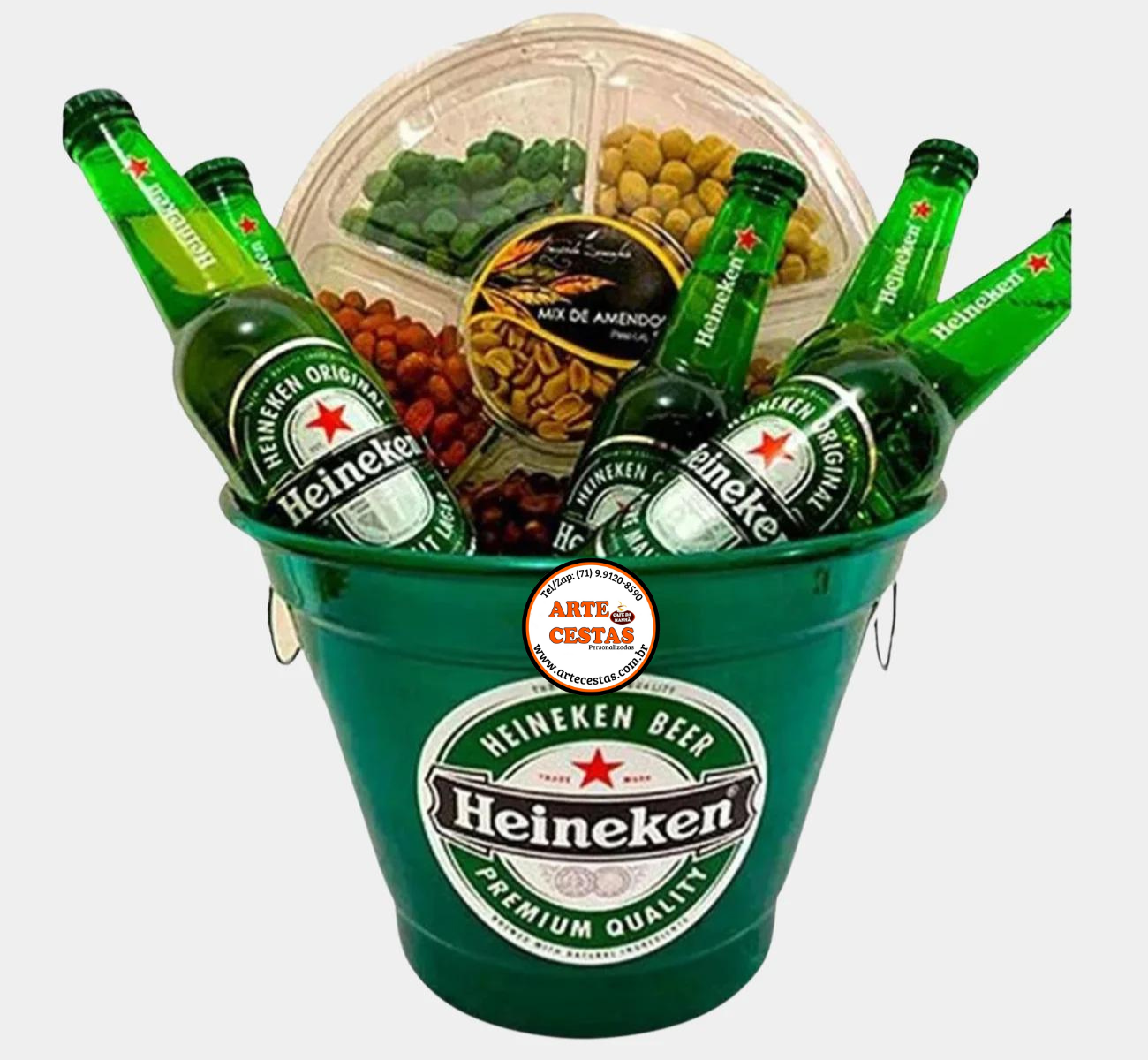 Balde de Cerveja Personalizado com 5 Cervejas Heineken, Mix de Amendoins 550g e Balde Reutilizável
